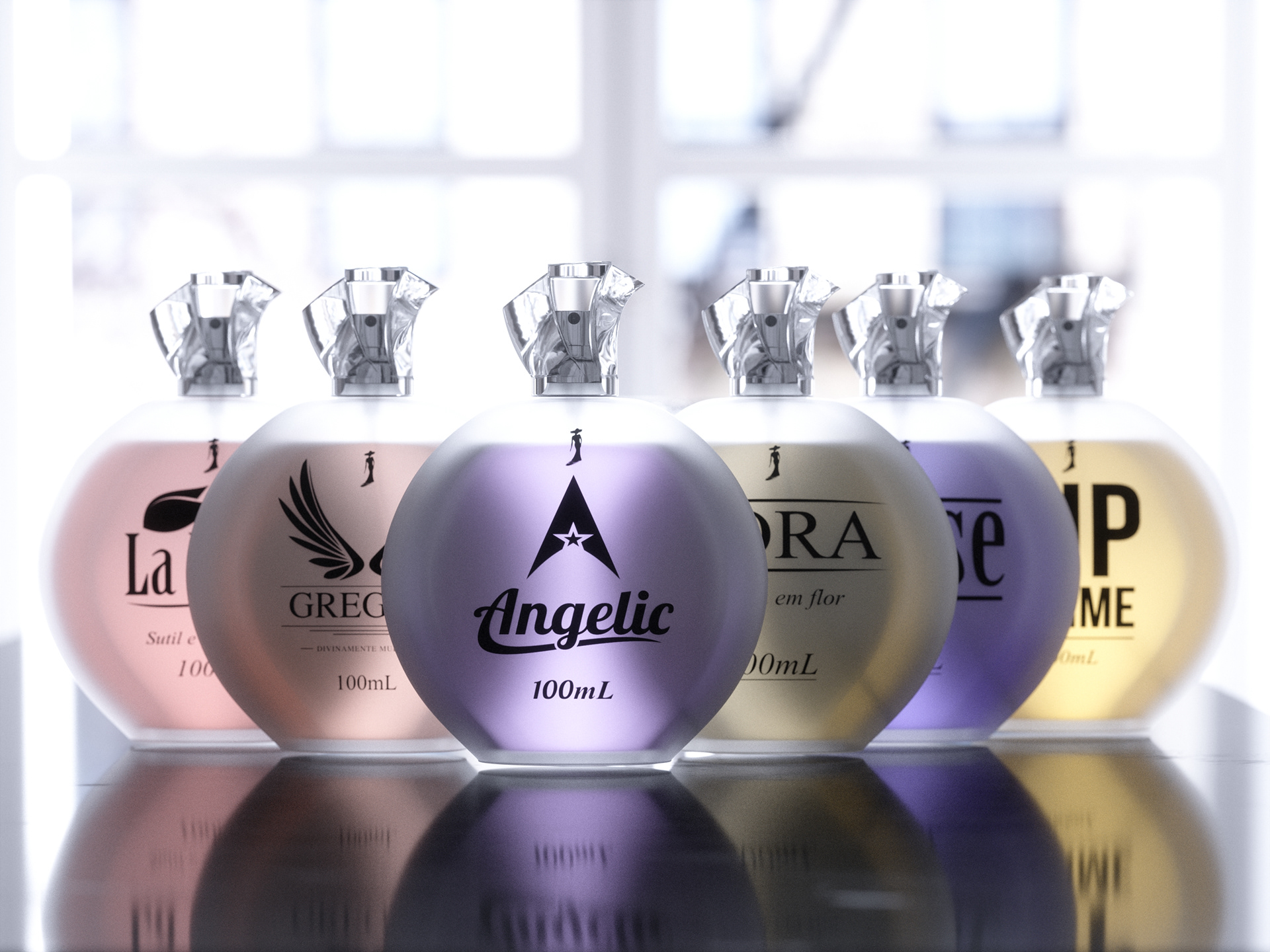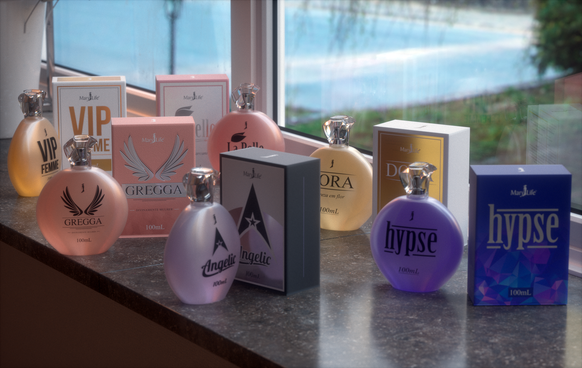 Criação de mockups para linha de perfumes Mary Life.